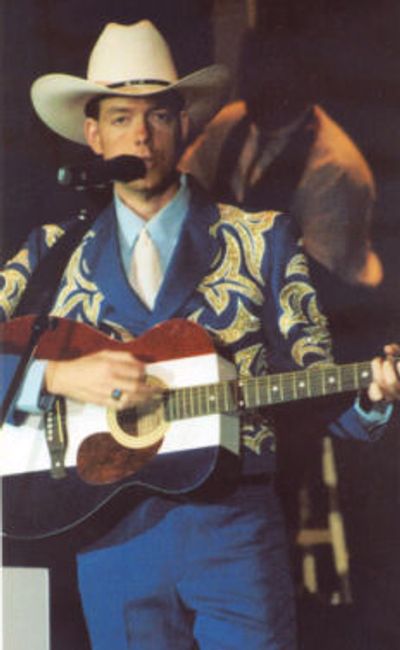 find them. I've finally got all of them except for the ones released overseas, and there's one 45 that I don't have called'Seasons of My Heart.'" Varnell is also a magnet for Buck Owens memorabilia. One very special item was acquired in 1998 between gigs at the North Carolina State Fair, where Varnell performs annually. A wax museum at the fair was populated by likenesses of such celebrities as Arnold Schwarzenegger, Sylvester Stallone, "Seinfeld's" Kramer... and Buck Owens, holding his trademark red, white and blue guitar. For several years, Varnell asked the museum owner whether the guitar was for sale, and each year the answer was "No." Persistence paid off on November 4, 1998 when the owner told Varnell he was closing up shop and finally offered the guitar for sale. "He also said he had this red suit
